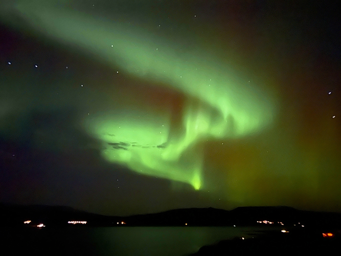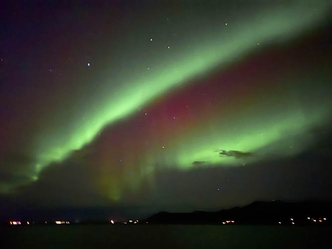 Northern lights above clouds enlightened by Borgarnes' city lights seen again from Villa Fjordblick