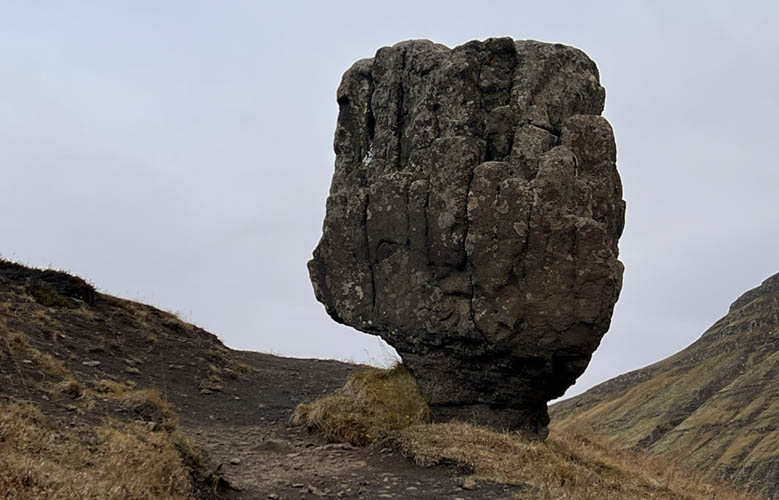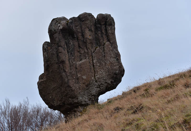This more or less balancing 3 meters high rock is called Staupasteinn or Steðji