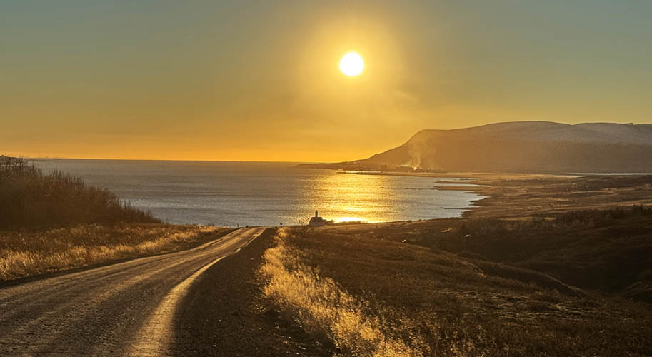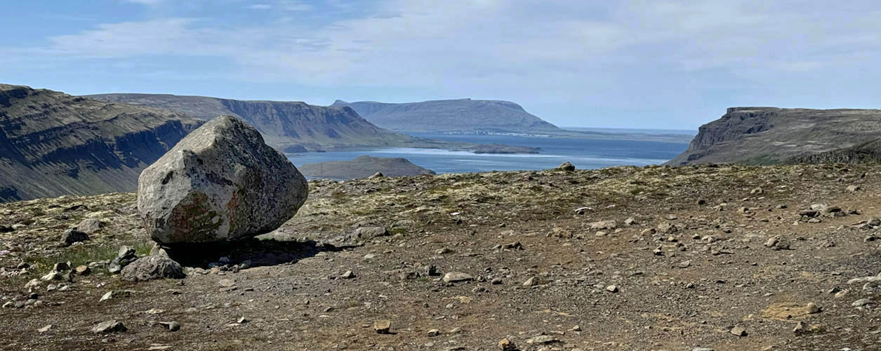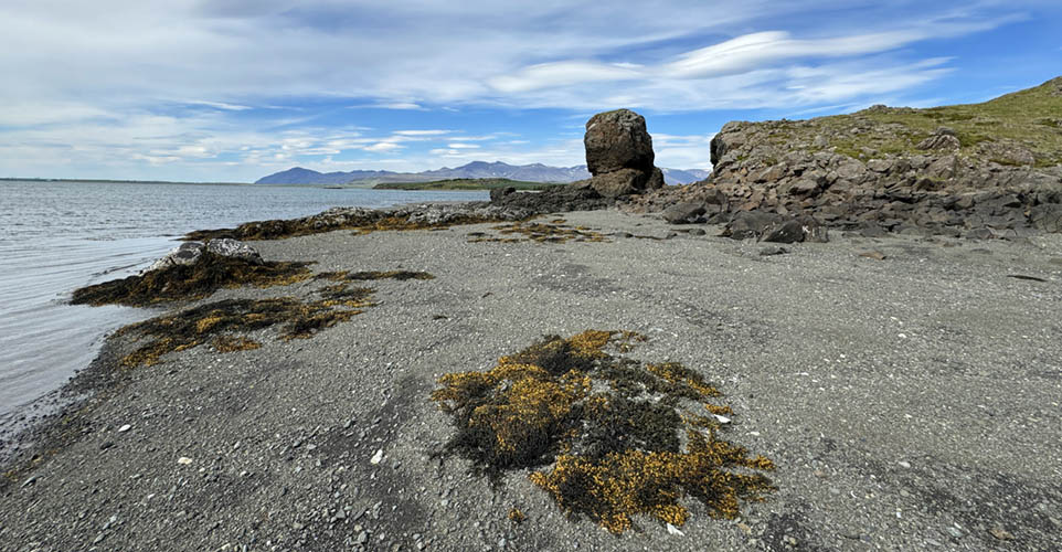 Maríuhöfn á Hálsnesi (behind the four dark hills) is considered as one of Iceland's first ports